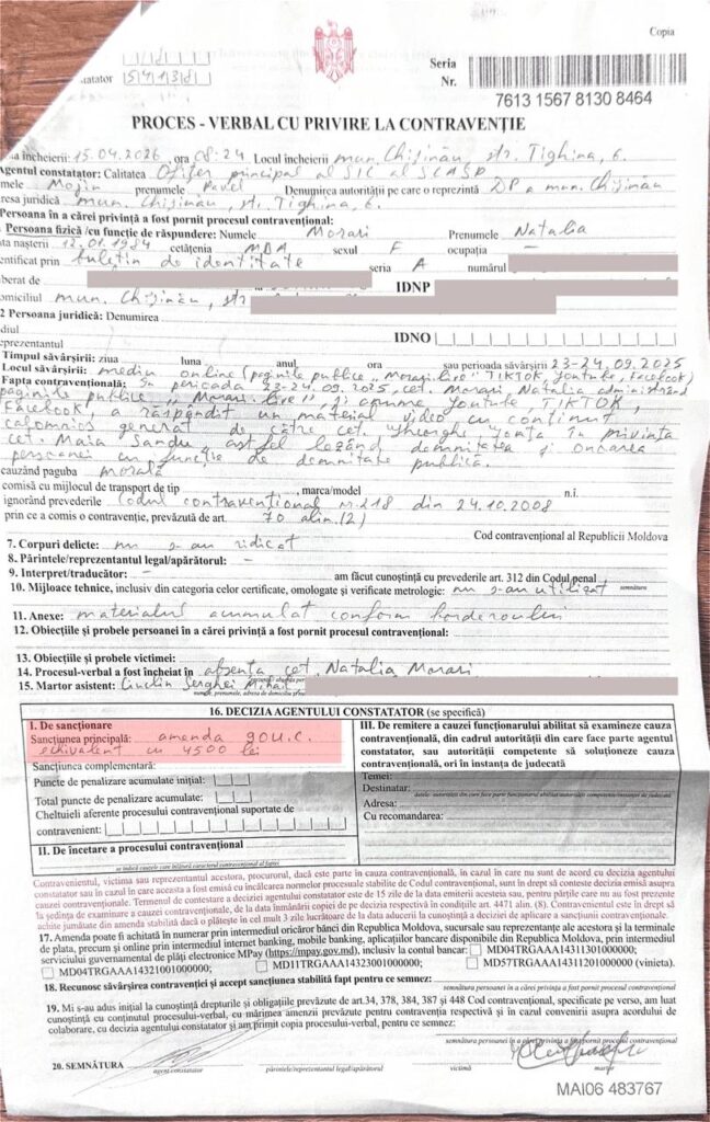 IMPORTANT Natalia Morari a fost amendată De către Redactia 3 - 23 aprilie 2026 0 28 FacebookXPinterestWhatsApp ‼️ Fără nicio supriza.Jurnalista Natalia Morari a fost amendată de Poliție cu 4.500 de lei, după plângerea depusă de către Maia Sandu Natalia Morari spune că nu va achita amenda și că va contesta decizia în instanță.